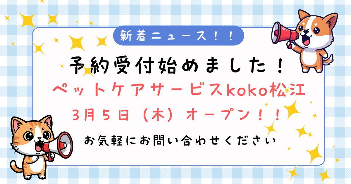 3月5日 ペットケアサービス koko松江オープン 予約受付開始しました! 2026 2/15 新着ニュース 2025年4月30日2026年2月15日 松江市でぺットシッターサービス・訪問介護サービスを始めました!! どうぞよろしくお願いいたします。 本日より予約受付を開始しました。お気軽にお問い合わせください。 お問い合わせは、メール、お電話にて承っております。 新着ニュース URLをコピーしました! 初回カウンセリング・登録無料キャンペーン実施中 この記事を書いた人 pcb-academy 関連記事 ペットケアサービスkoko松江 3月5日オープンします! 2026年1月21日 初回カウンセリング・登録無料キャンペーン実施中 2025年5月1日 コメント コメント一覧 (1件) こんにちは、これはコメントです。 コメントの承認、編集、削除を始めるにはダッシュボードの「コメント」画面にアクセスしてください。 コメントのアバターは「Gravatar」から取得されます。 返信 コメントする コメントをキャンセルコメント ※ 名前 ※ メール ※ サイト 次回のコメントで使用するためブラウザーに自分の名前、メールアドレス、サイトを保存する。
